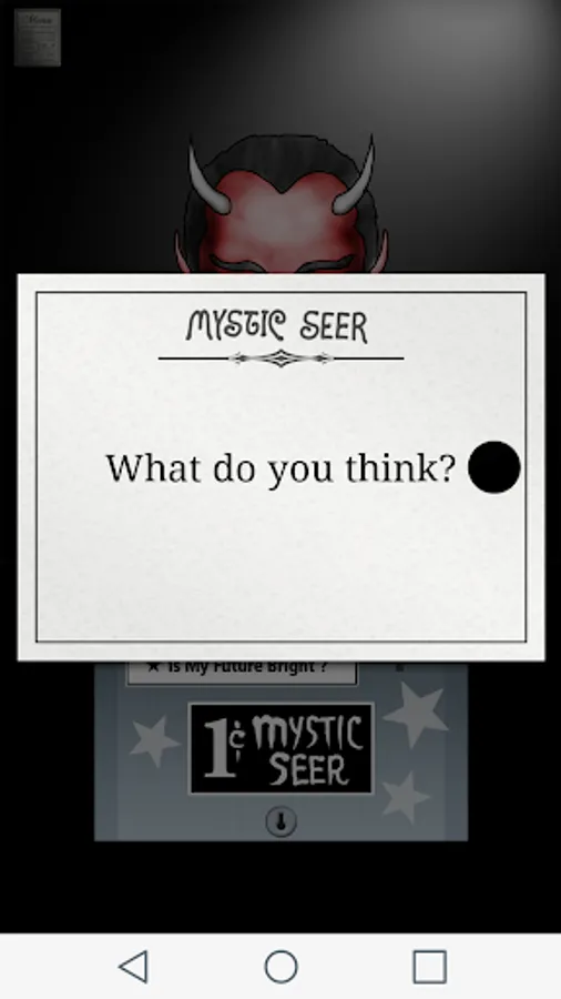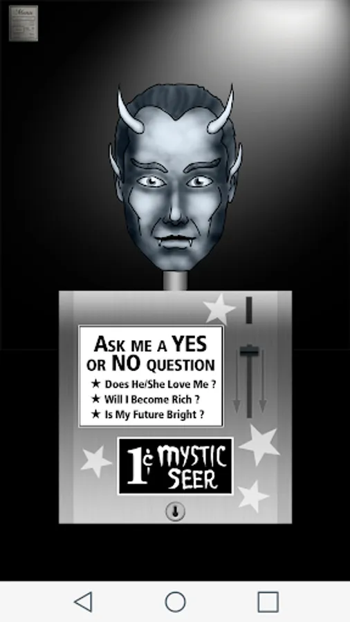 You are about to be given a gift that few humans will receive in their lifetime. This app will respond to YES or NO questions with shockingly accurate divinations at the pull of a lever. But do you dare glimpse in to your future events? Can you handle future knowledge without being enslaved by fear and superstition. The Mystic Seer will tell your future. A gift or a curse? That will be your choice.