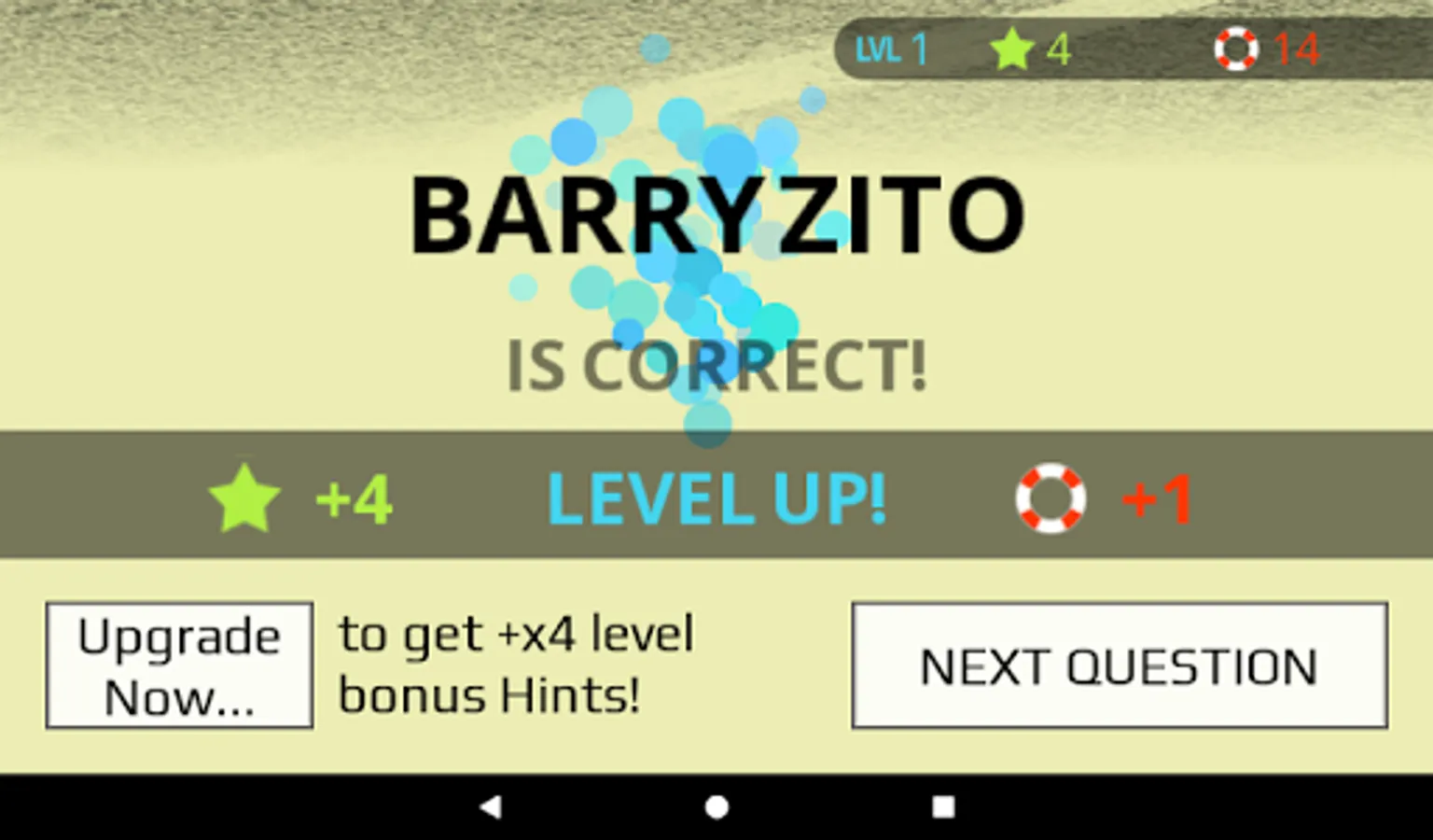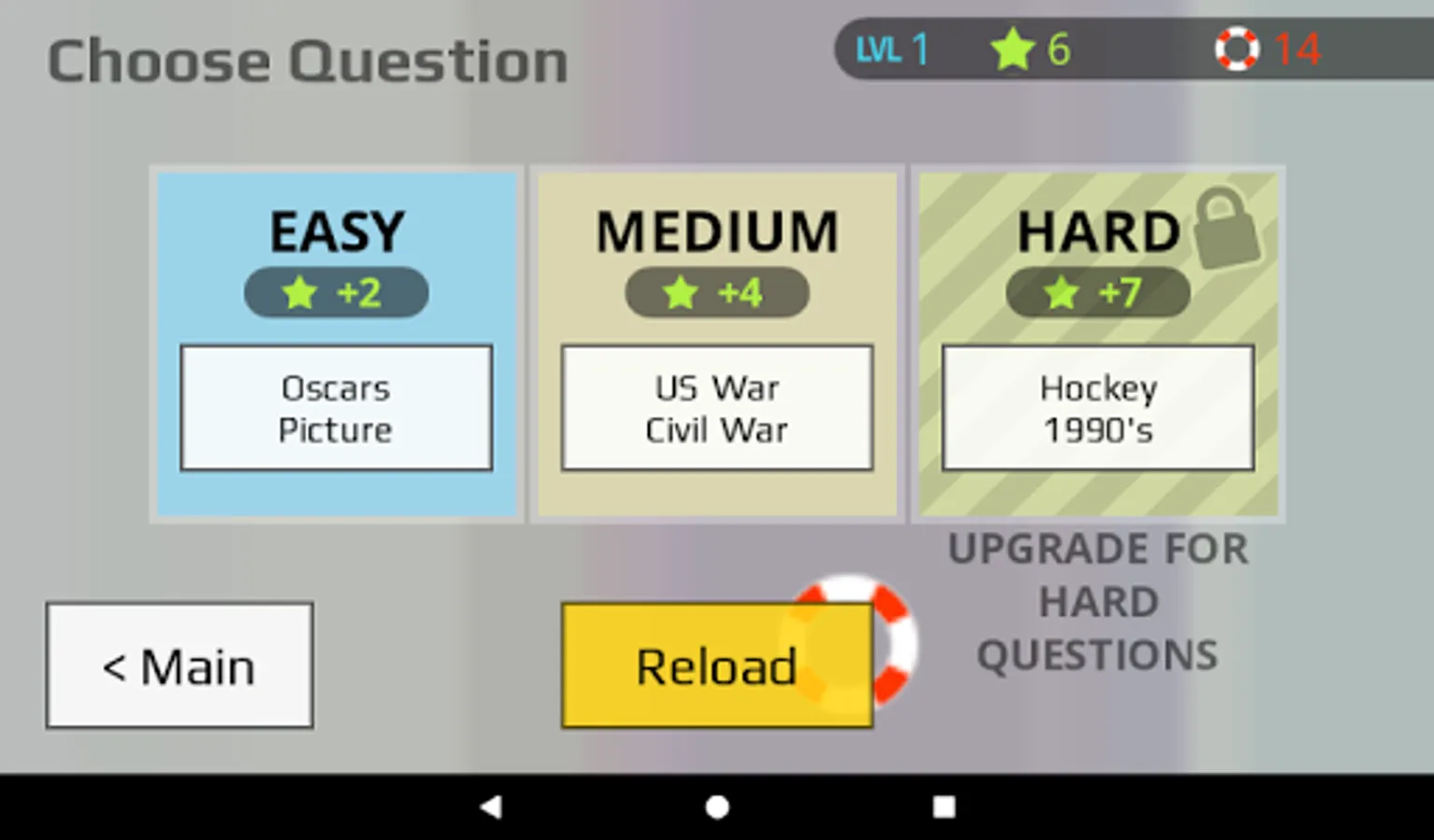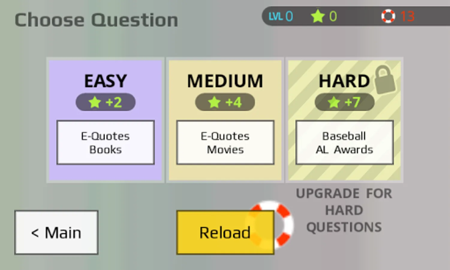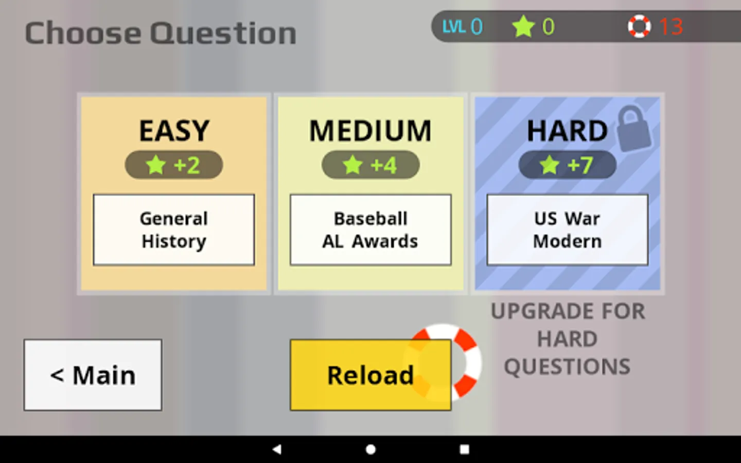 Free LITE VERSION has access to half the EASY and MEDIUM questions, and no HARD questions. Upgrade to FULL VERSION to access all questions pursuit. Upgrading will also remove all ads and increases Level Up Hints bonuses by x4.