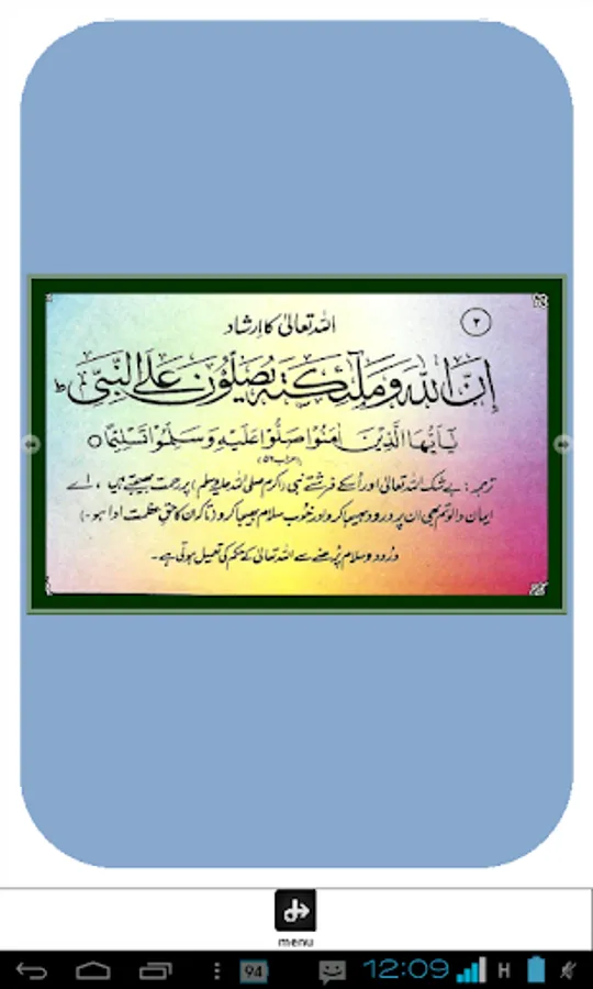 إِنَّ اللَّهَ وَمَلَائِكَتَهُ يُصَلُّونَ عَلَى النَّبِيِّ يَا أَيُّهَا الَّذِينَ آمَنُوا صَلُّوا عَلَيْهِ وَسَلِّمُوا تَسْلِيمًا بیشک اللہ اور ا س کے (سب) فرشتے نبیءِ (مکرمّ صلی اللہ علیہ وآلہ وسلم) پر درود بھیجتے رہتے ہیں، اے ایمان والو! تم (بھی) اُن پر درود بھیجا کرو اور خوب سلام بھیجا کرو