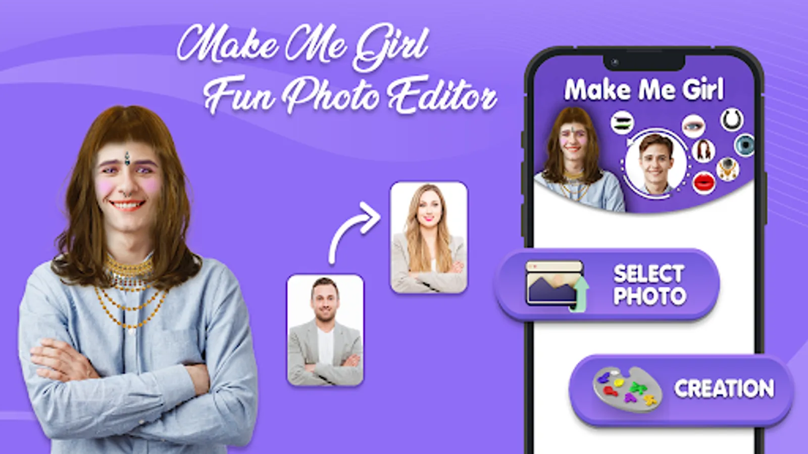 Make Me Girl Fun Photo Editor is a photo editor app that offers you a variety of “photo stickers” of Girl . to add to your photos and give a virtual makeover to your face in a second by using Stylish Girl make me gorgeous.