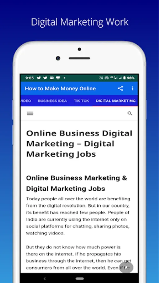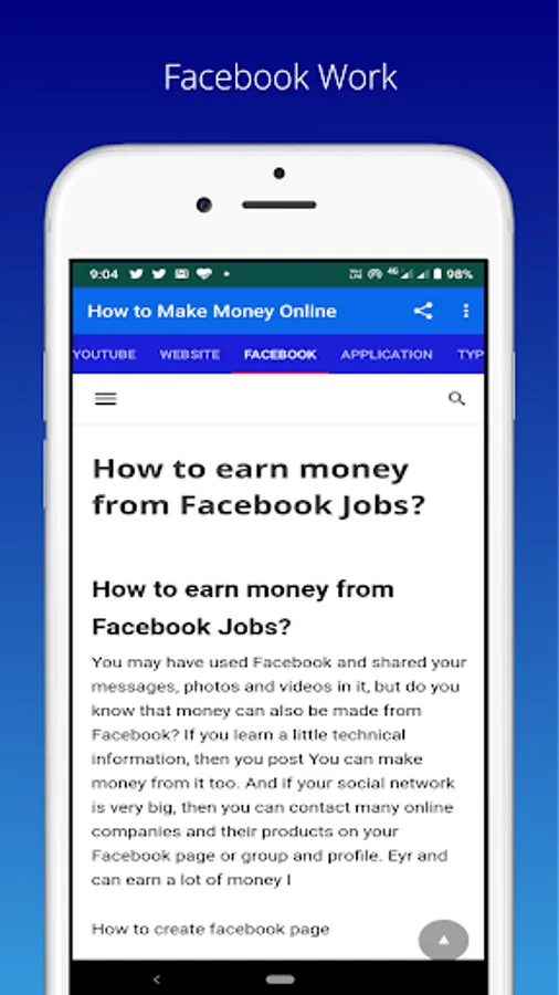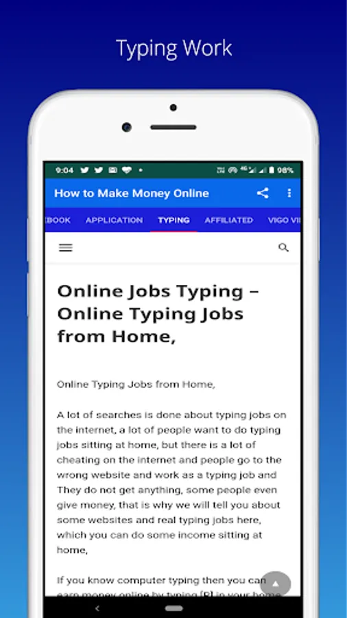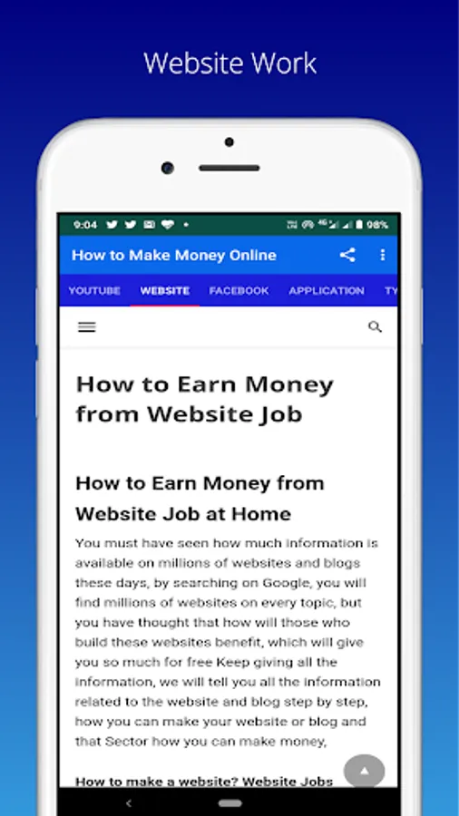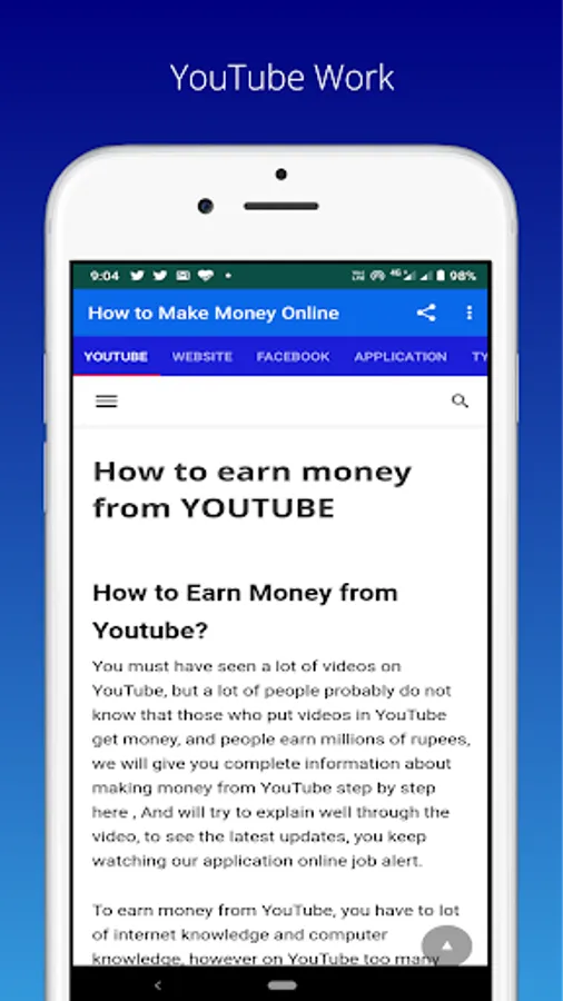 Is app me apko bataya gaya hai ki ap online paise kaise kama sakte hain. Internet par lahon log aaj search karte hain paise kamane wale app konse hain, website konsi hai. Lekin unhe sahi jankari nahi mil pati. Isiliye humne yeh app banai hai. Jisme apko internet par online paise kamane ke bilkul geniune ratike baaye gaye hain. Jaise