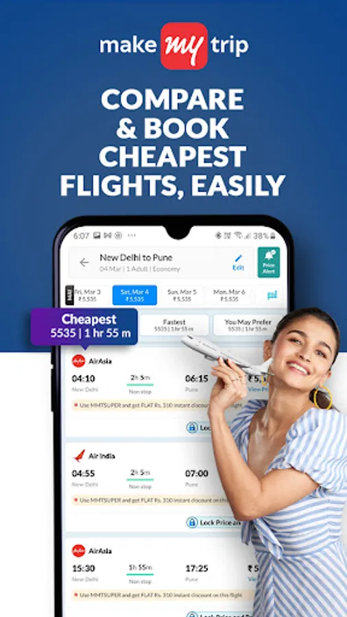 Our flight ticket booking app lets you compare flights, check ‘where is my flight’ & flight status and provide super flight deals & offers on domestic airlines.