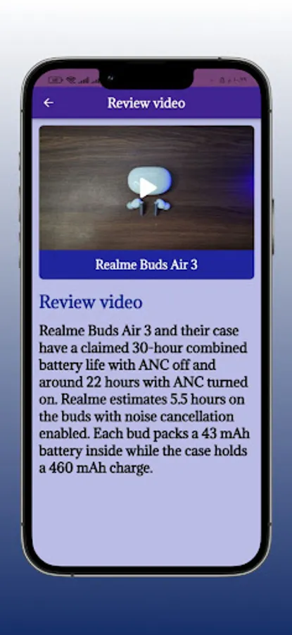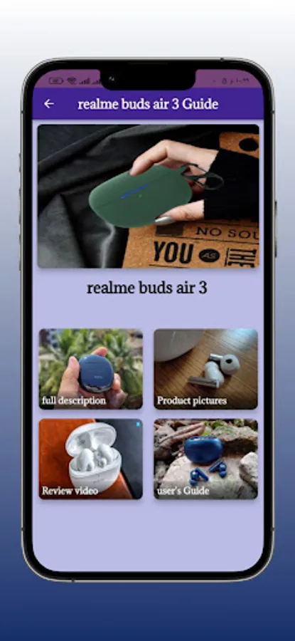 Photos and Design: Explore a collection of high-quality photos that showcase the design and aesthetics of the Realme Buds Air 3. The app allows you to view the earbuds from various angles, providing a detailed look at their sleek and stylish design.