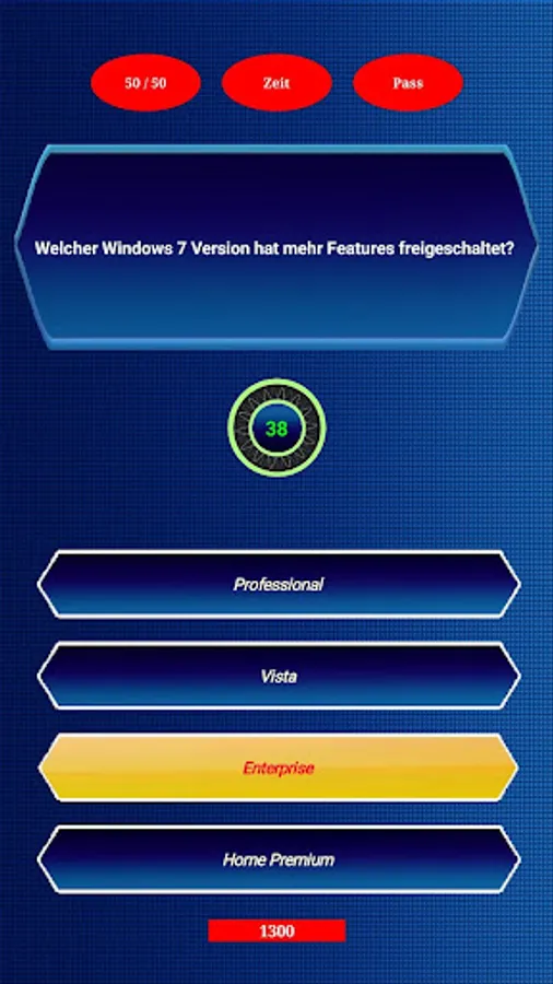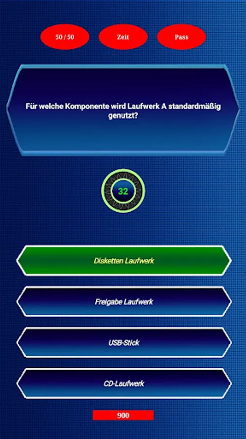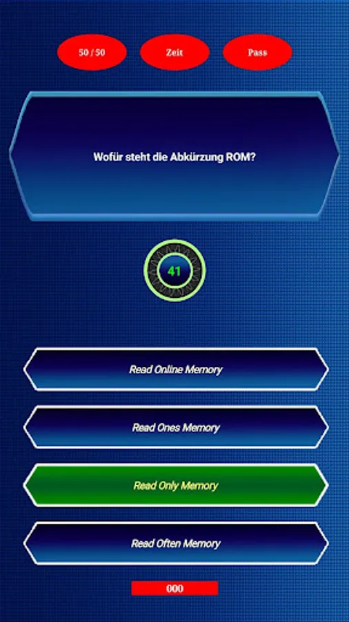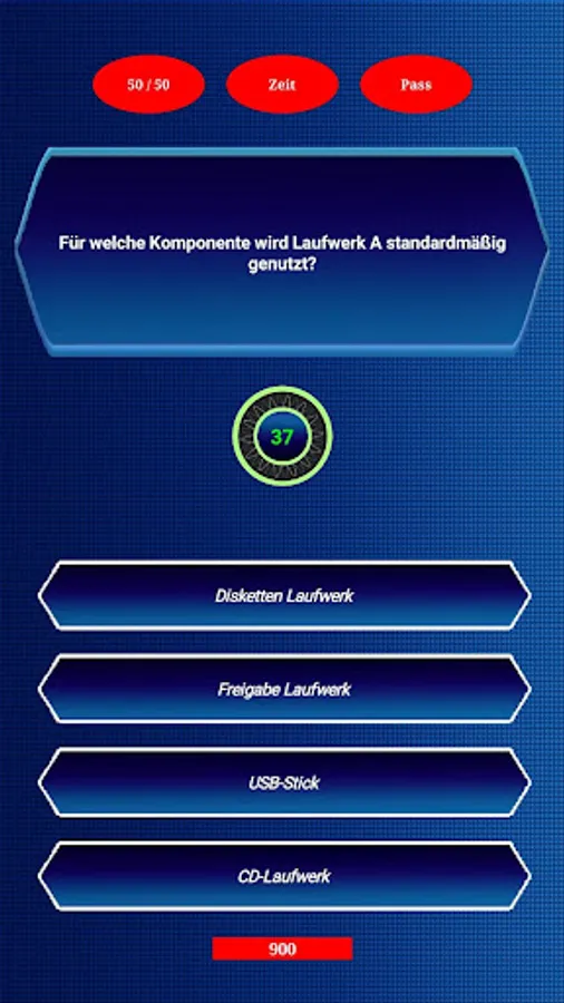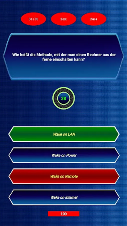 It will be provided with 4 Auswahlmöglickkeiten questions, one of the choice is the correct answer and the remaining three false. In answering a question are 45 seconds. Lose one does when one wrong answer a question or not answer the question within 45 seconds. (Sudden Death) But as long as the questions are answered correctly, it goes on with more questions. During the game three jokers are at Auwahl. 50/50 (fifty / fifty), 1x skipping, 1x time.