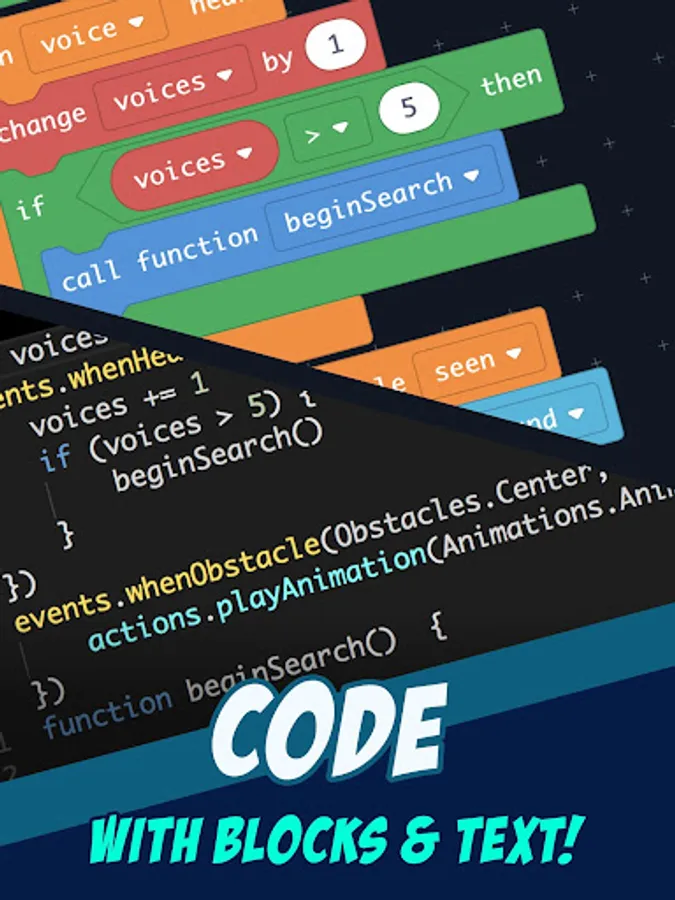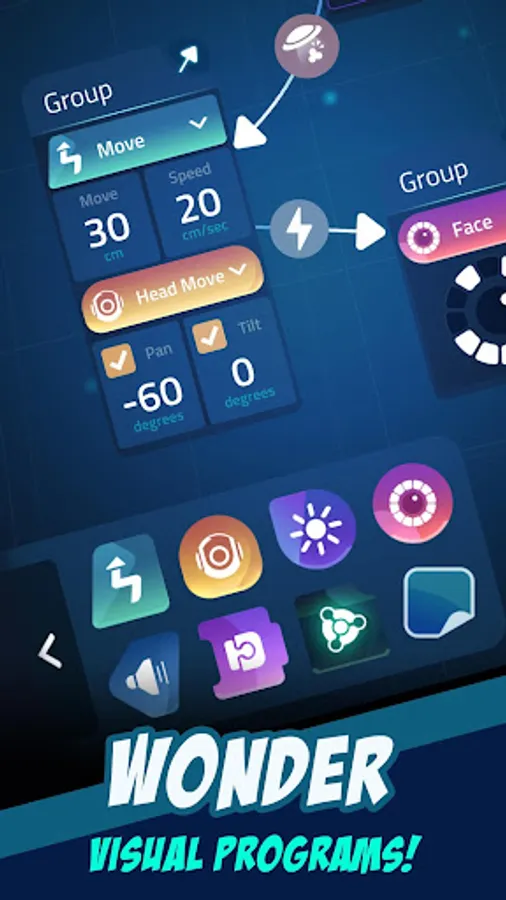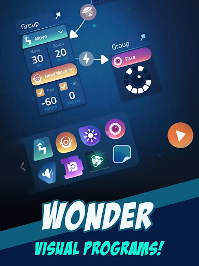 Send and receive chat messages to learn about your new robotic companion. Customize sensor input to react with lifelike behaviors. Easily switch between block-based graphical programming or text-based code to build your own powerful programs at the skill level that’s right for you. With control mode, you can pilot cue through exciting robotics adventures as you seek, avoid, and explore!