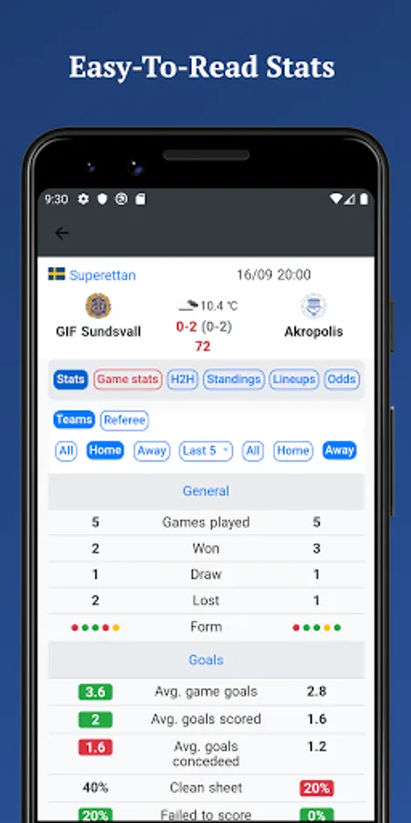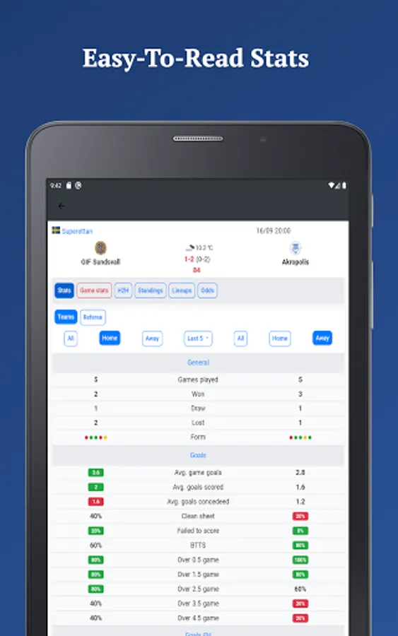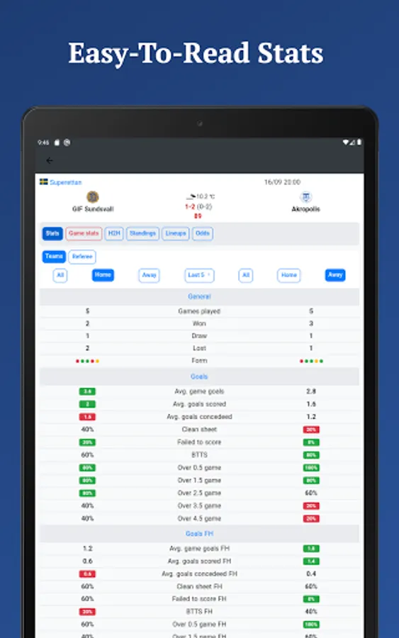 Get easy to read football stats and live scores in same app. Goals, corners, cards, HT, FT, referee stats, you can find all this in the app.