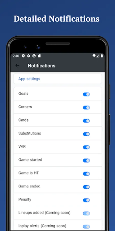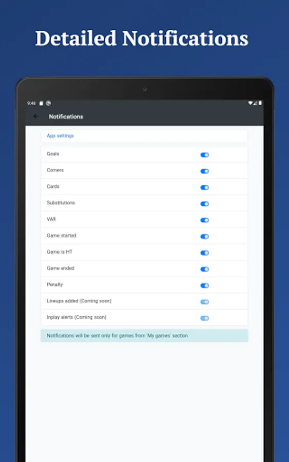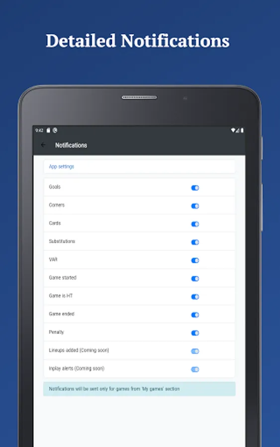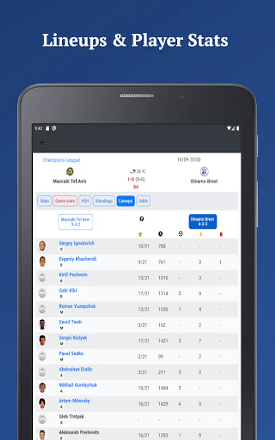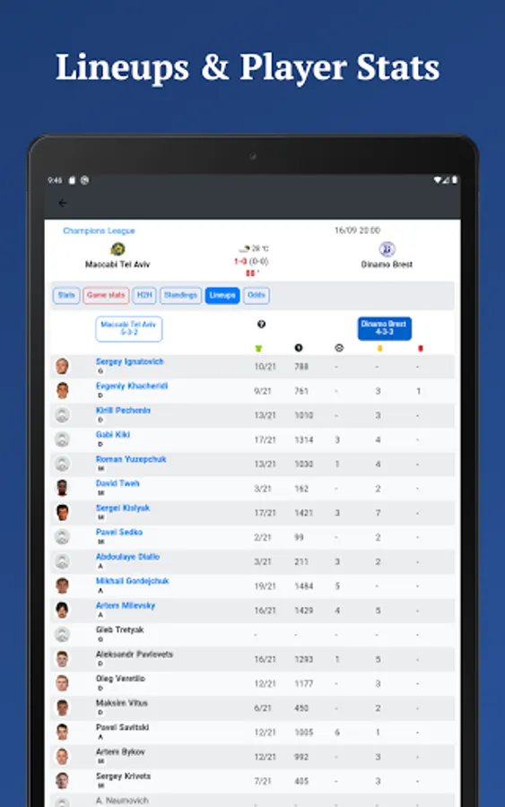Lineups - Detailed statistics about players (games played, cards, goals, etc.). Get notifications when lineups are available for a game.