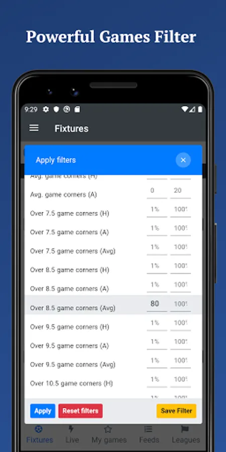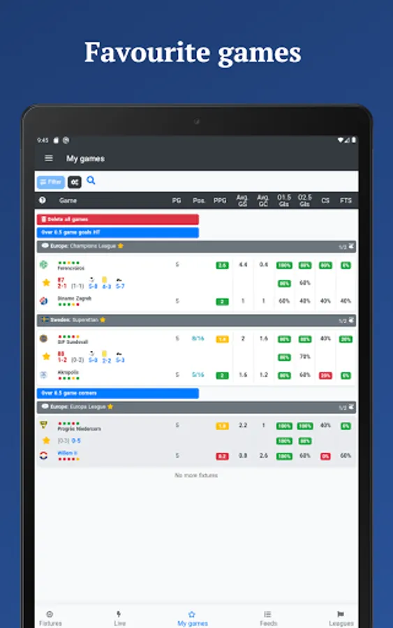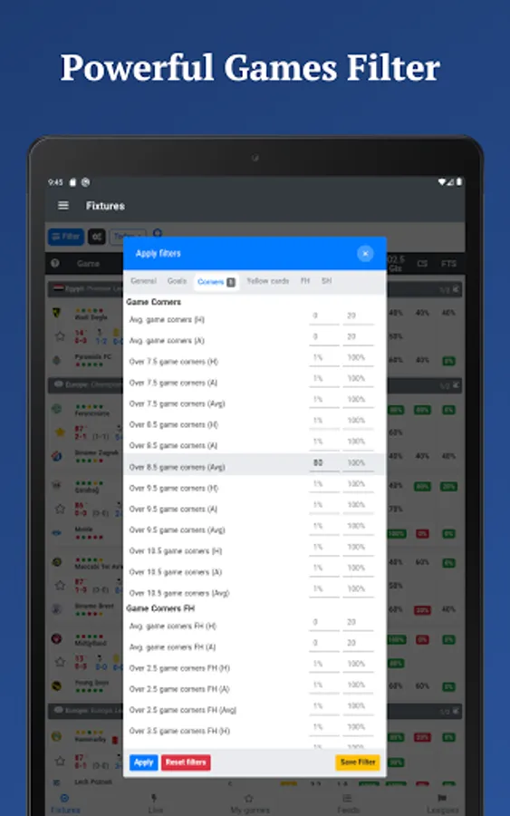Games Filter - Search games that meets your criteria. E.g.: see only games with more than 70% over 2.5 game goals in last 5 games at home. You can search by any stat you want.
