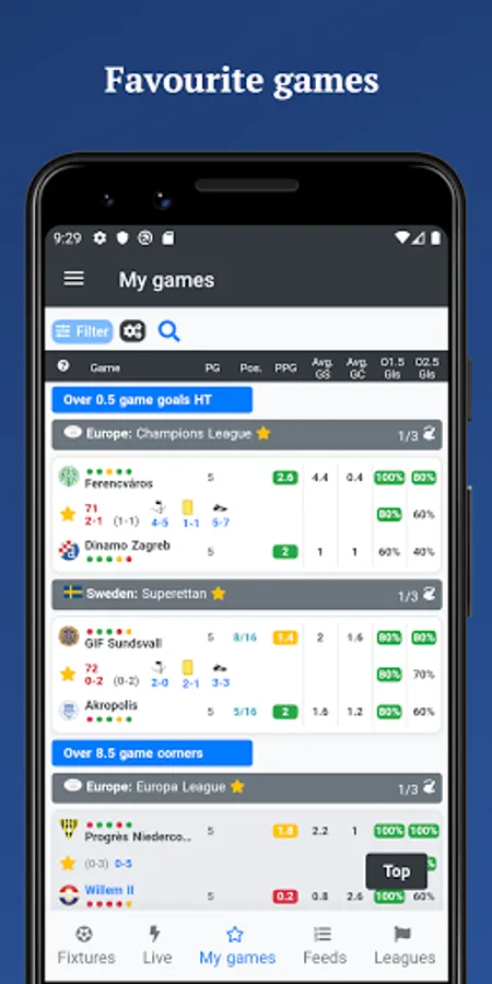 Favourite Games - Choose your games to follow and get instant notifications for every event (goals, corners, cards, substitutions, VAR, etc.). You can group your games by betting lists, so you know what you are looking for in a certain game.