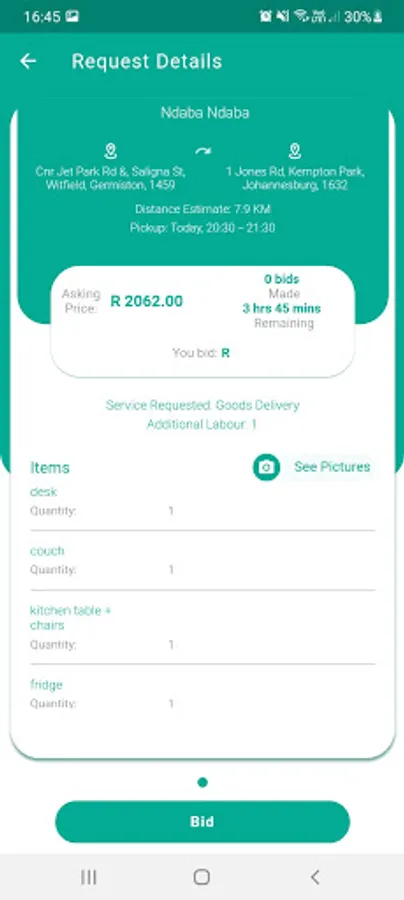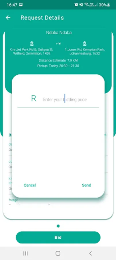 1. Receive delivery request (includes pick-up and drop-off addresses, delivery distance, request schedule, requester name and details of the goods).