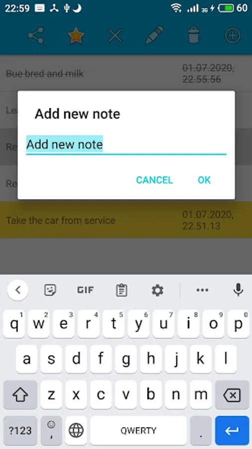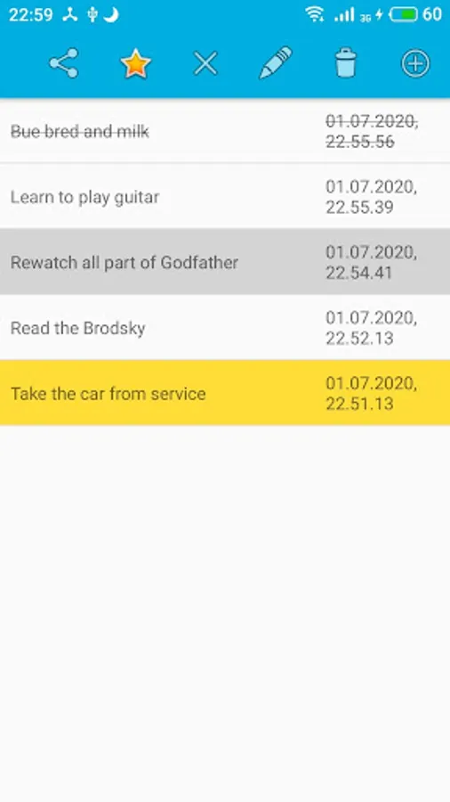 Simple app for notes. There is ability to adding, editing, removing, marking, crossing out, sharing the notes. The notes are stored in database.