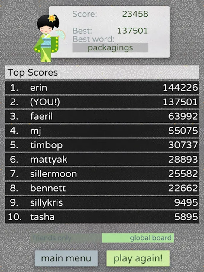 Connect with your friends to exchange gifts (send your BFF a “Y”! ...or better yet an “e” or an “s”) and compete on leaderboards. Create longer, more complex words to rack up a high score and climb the charts.