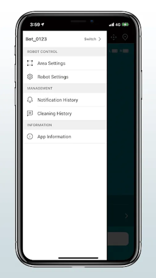 You can use the following features with this application; CLEANING in several modes, MAPPING for recognizing the shape of the room, CLEANING HISTORY for confirming the cleaned date/time with the map of cleaned area, and SETTINGS.