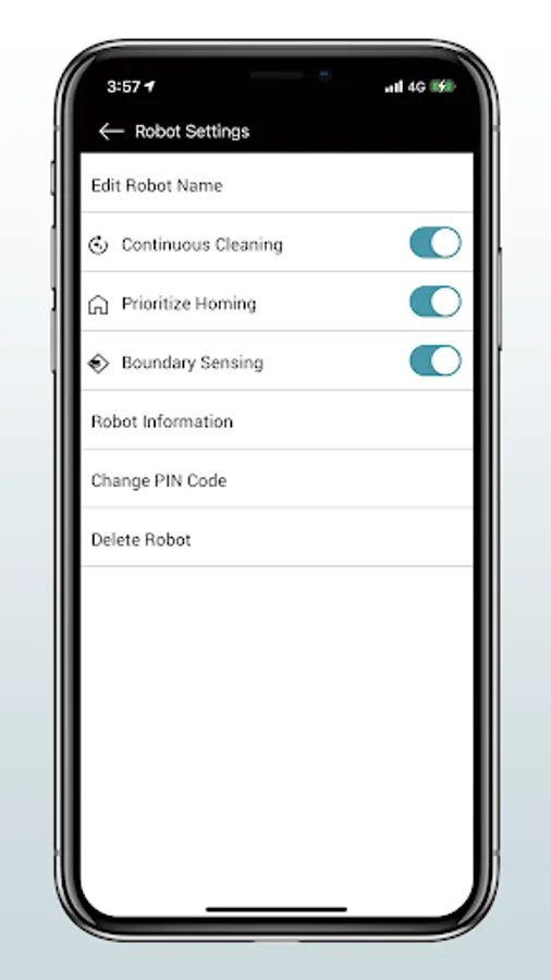 ・ROBOT SETTINGS…Continuous Cleaning, Prioritizing Homing Function, Boundary Sensing, etc.