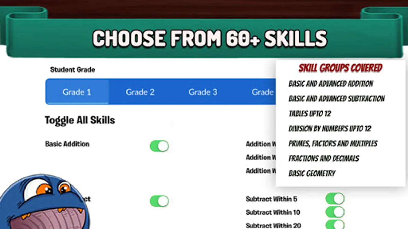 The math battles are fully customizable – you can select the arithmetic skills suited to your child’s aptitude, moving between basic and advanced skills as needed.