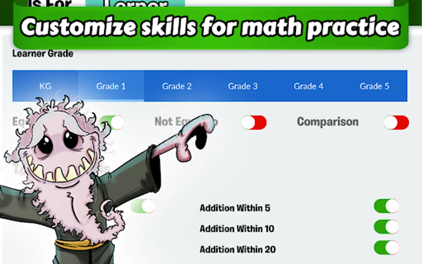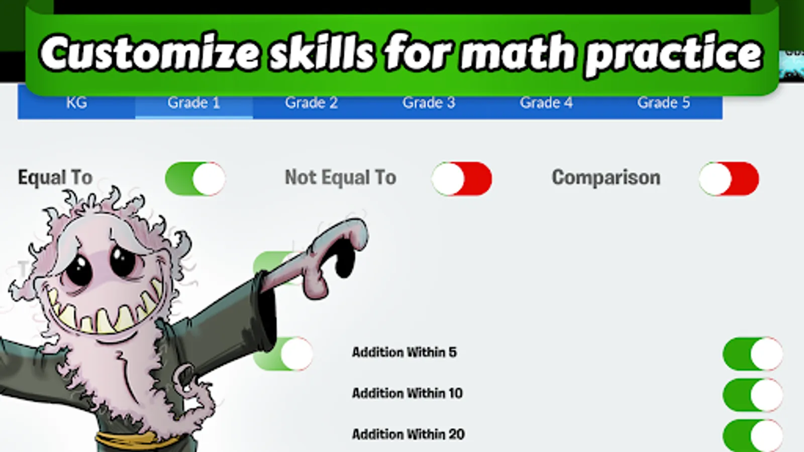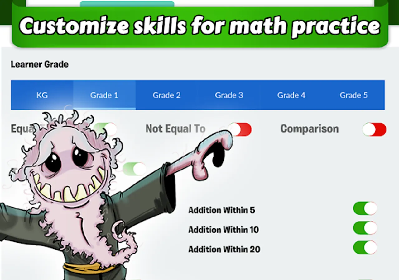 • Monster Math is better than homework, and it’s the perfect math trainer for your child. Practice addition, subtraction, multiplication and division with Maxx! Monster Math’s multilevel system is designed to guide struggling kids towards the right answers.