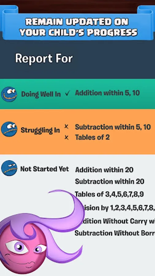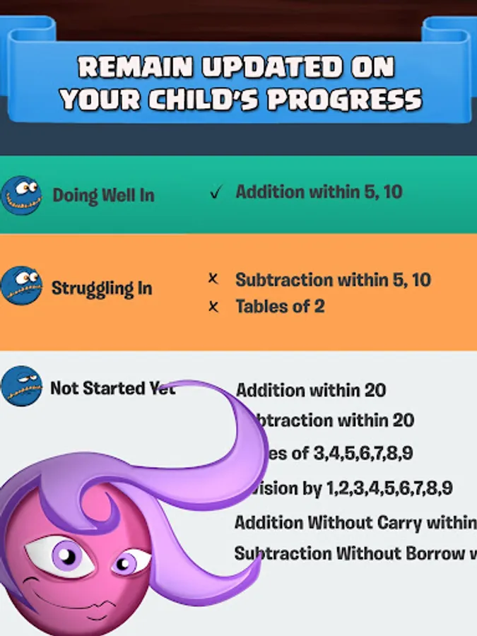 Monster Math provides a brand new story and a different kind of adaptive game play to keep the math levels at the right place for kids. Let your kids progress through learning their basic math skills while having loads of fun! Kids love Monster Math!