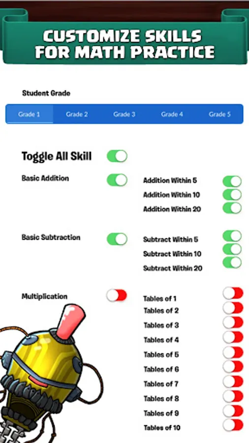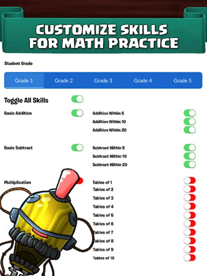 Want your child to practice specific skills? No problem! You can select only certain skills in the parental section so that the practice is limited to those. And you can customize these settings for each child separately.