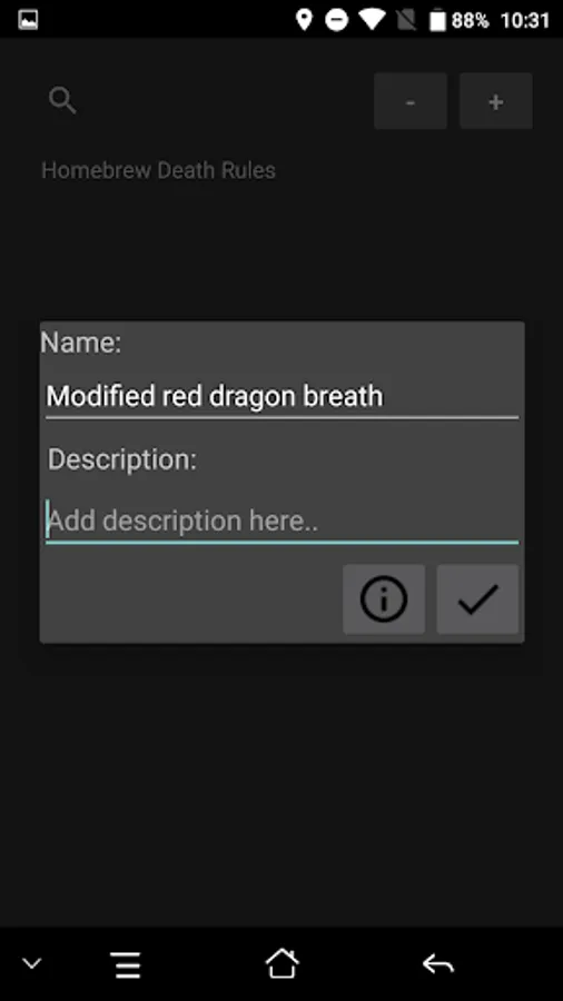 - Support for User Added entries, to save homebrew rules or manually input rules I was not allowed to include (not in SRD).