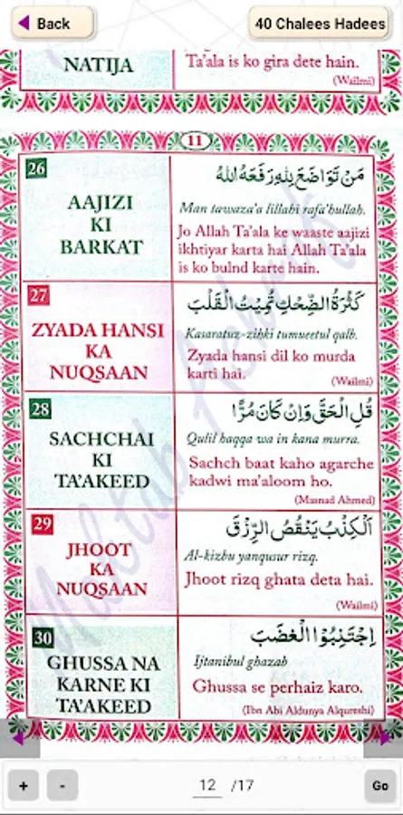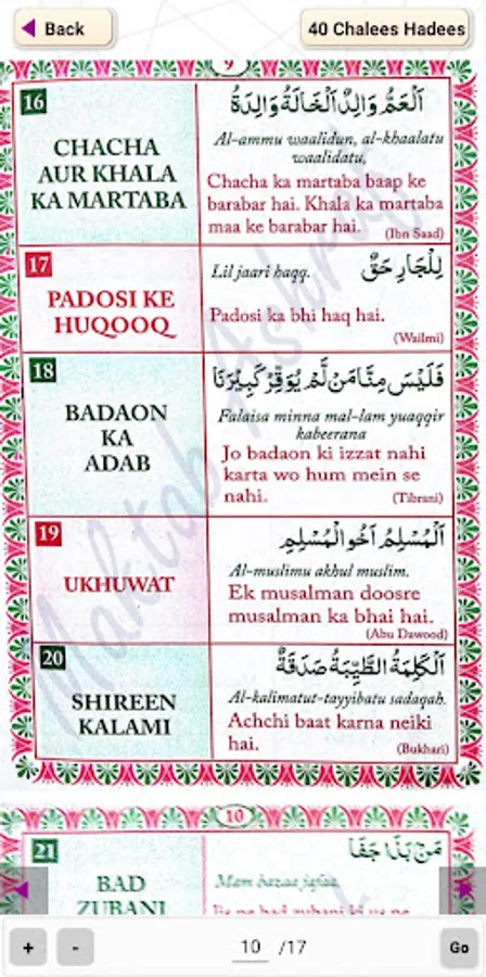 40 Hadith Urdu is an android application that is collection of forty hadees e Nabwi S.A.W. in Urdu Translation.This application is the best app to remember and learn hadith in the best way.