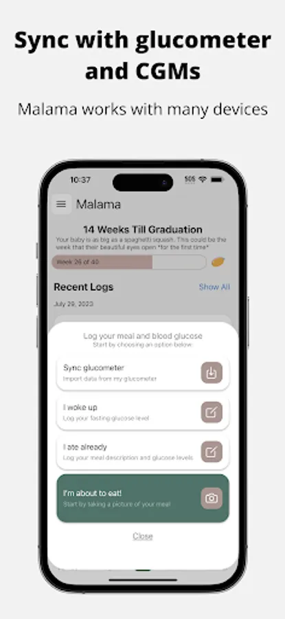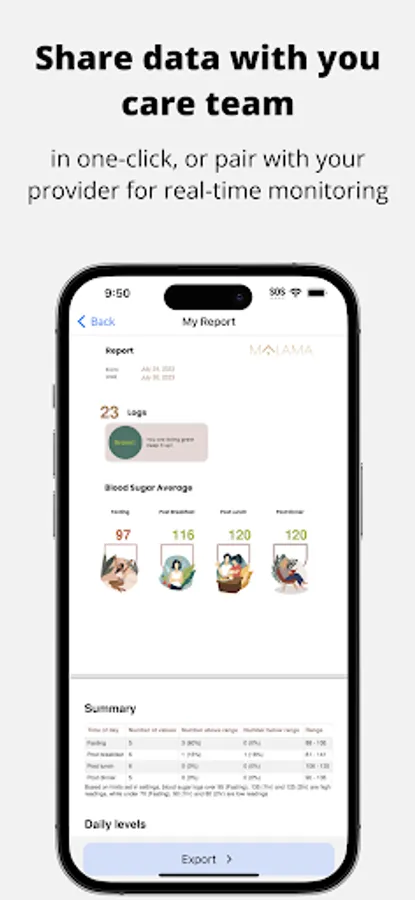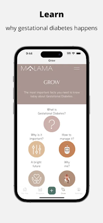 Malama is a mobile solution for women managing gestational diabetes. Key features include: syncing glucose levels, accessing educational content, and visualizing trends.