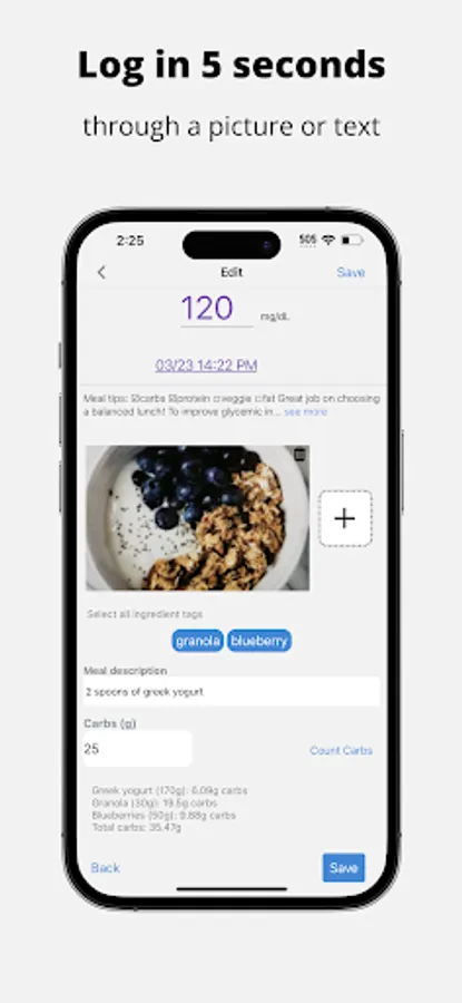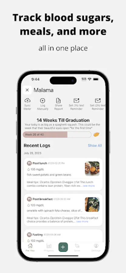 After syncing your glucose levels, you can add meal tags, photos, and notes to share with your care team.