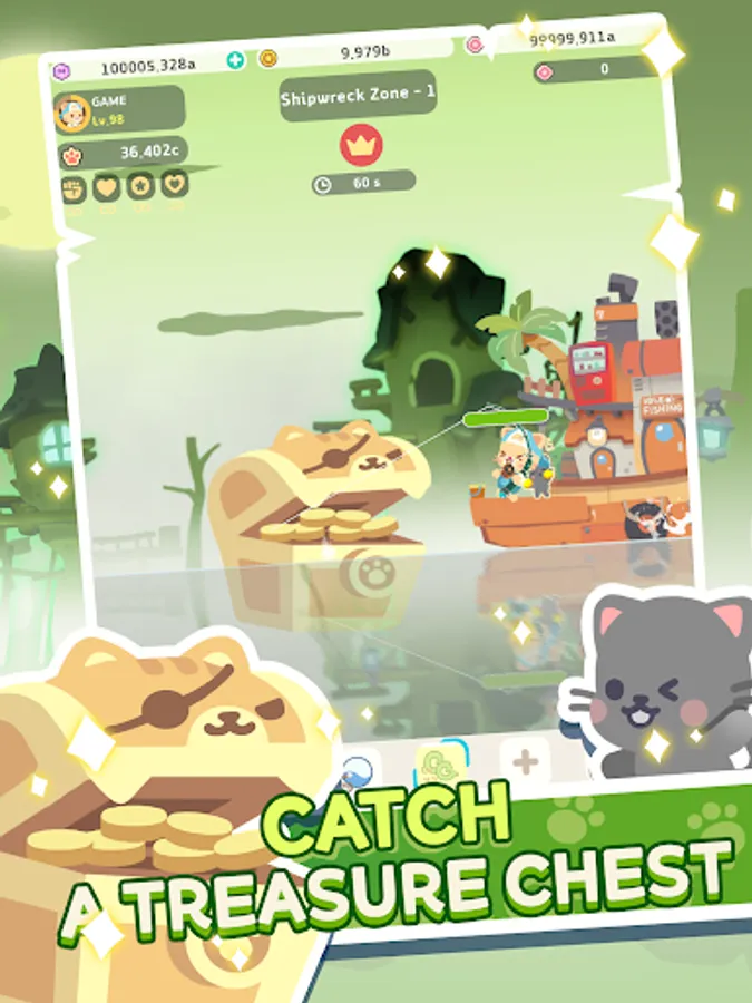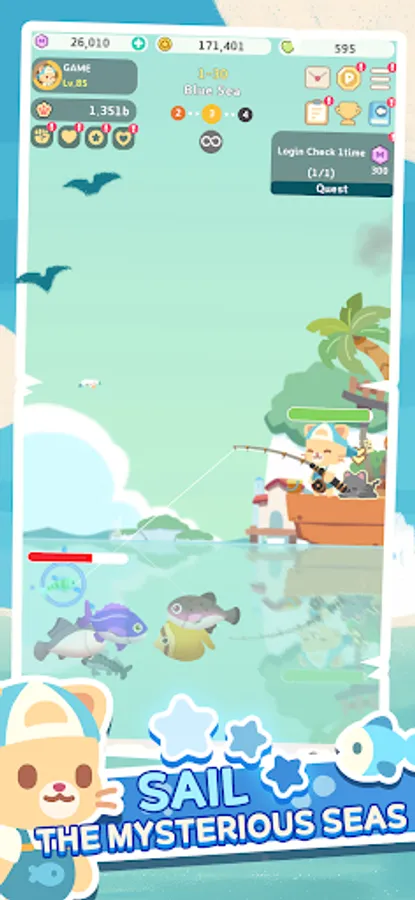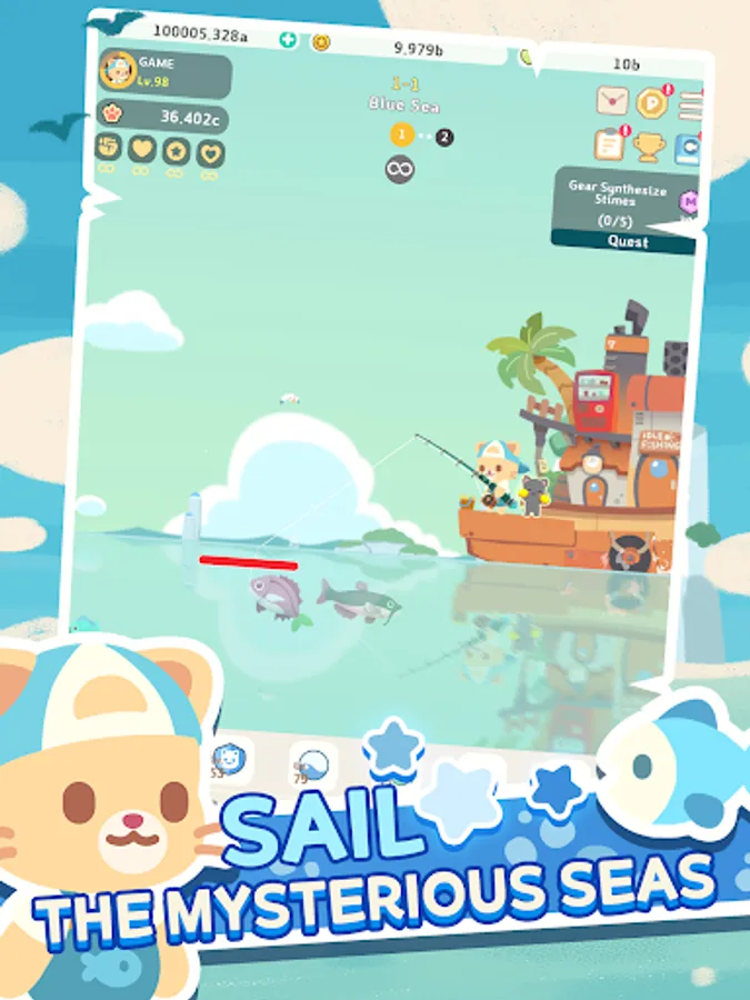 Idle RPG healing game where you explore a fantasy sea and catch various fish with a cute cat, 'Idle Fishing: All Blue'!