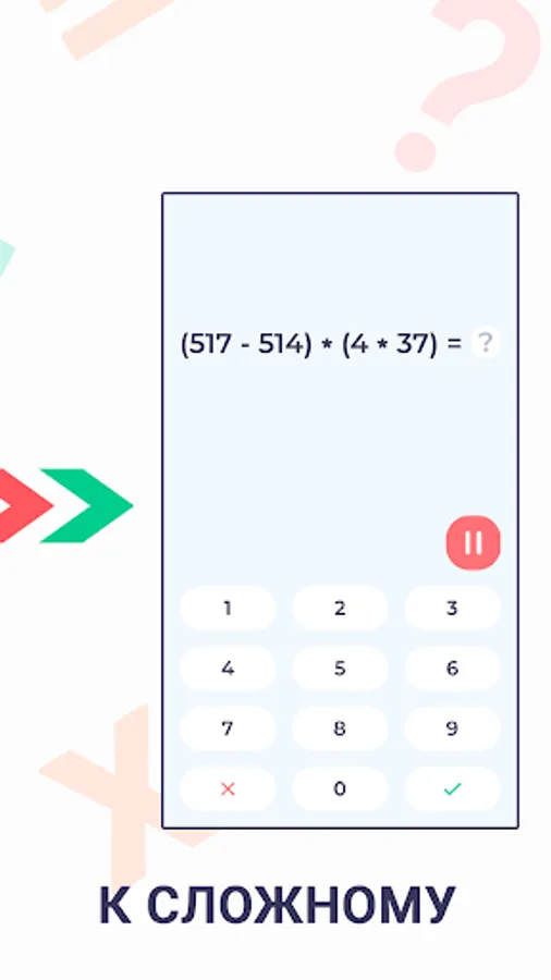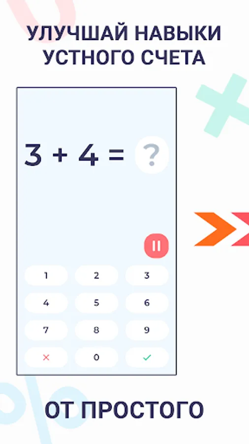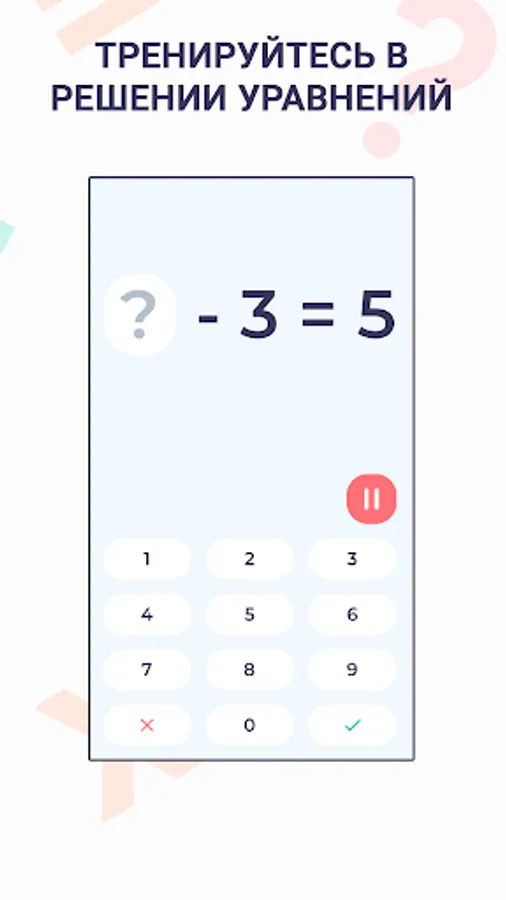When you get tired of just solving examples, turn on the equations mode in the settings, so the verbal counting will sparkle for you with new colors. In equation mode, a question mark may appear not only to the right of the equal sign, but also in place of any other number.