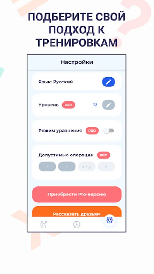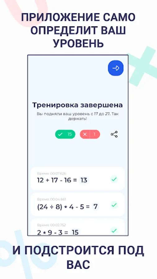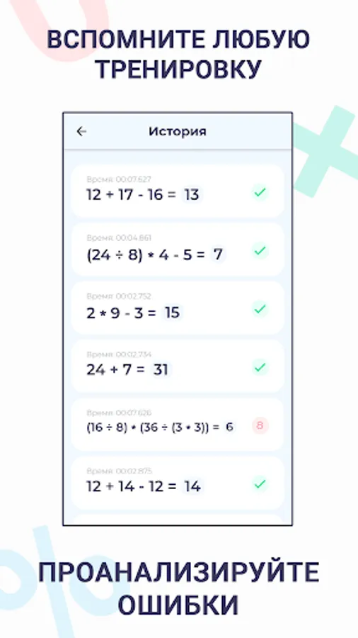 It is important to correct your mistakes: mathematics is an exact science. After each workout, you will see the history of all calculations, and you can also view it at any time on the workout history screen.
