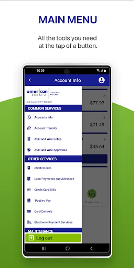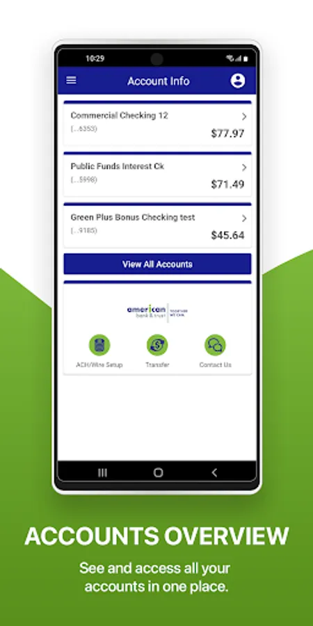 Conduct banking anytime, anywhere with American Bank & Trust! Available to all Business eBanking enrolled subscribers as a complimentary service. You are responsible for only the fees that may be associated with the contract governing the use of your mobile Android phone device. American Bank & Trust allows you to check balances, make transfers, and pay bills. Need to find an American Bank & Trust branch or ATM closest to you? With Find Near Me, American Bank & Trust Mobile will discover your location and provide you with addresses and phone numbers on the fly.