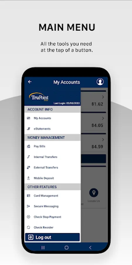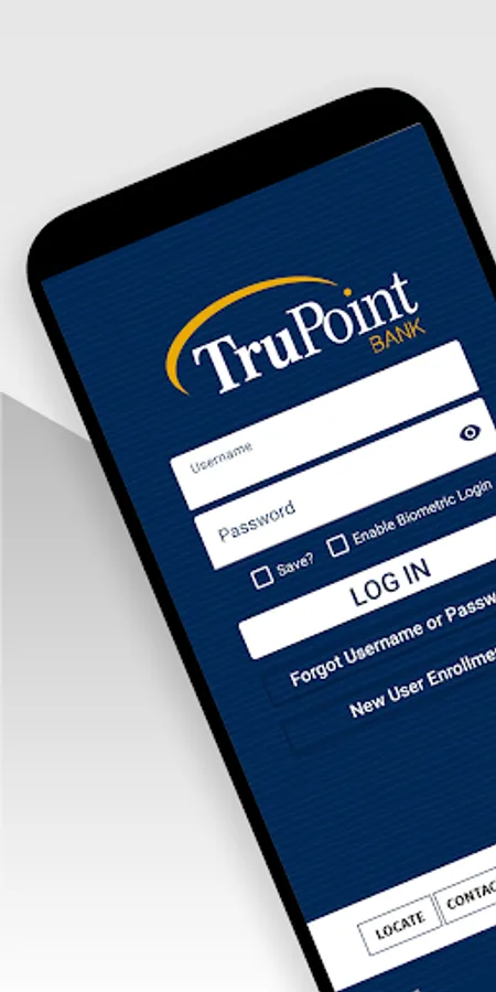 A TruPoint Bank online banking account is required. Third party standard data and messaging rates may apply. Location permission is needed to find the nearest locations.