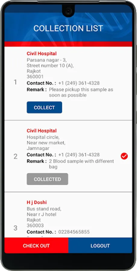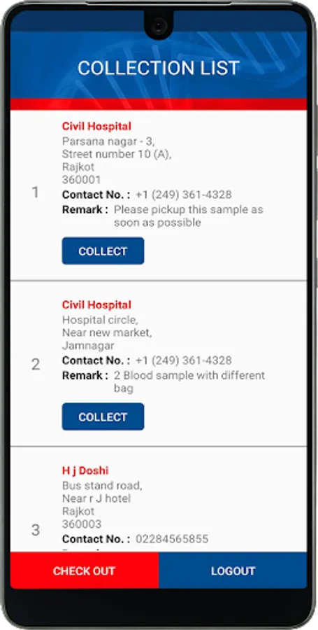 This app is specially designed to manage the multiple staff in multiple location for collection of sample i.e. Blood & Urine.
