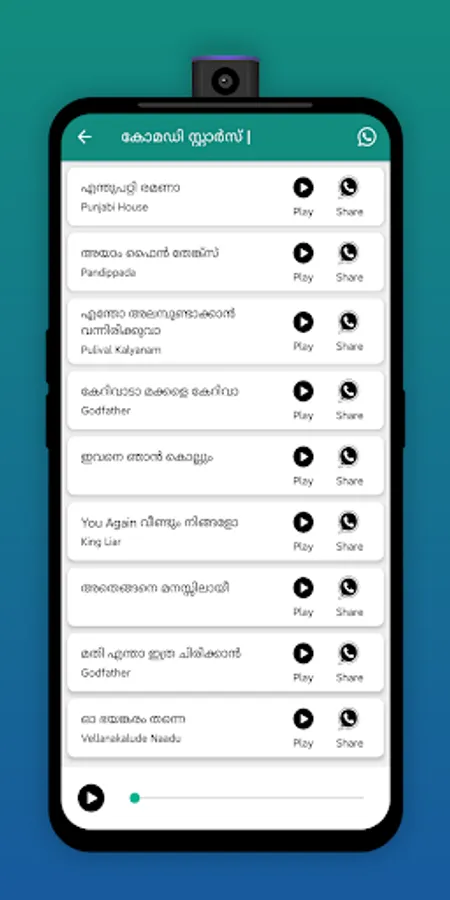 With a wide range of popular movie dialogues from some of the biggest names in Malayalam cinema, our app has it all! From comedy dialogues by Salim Kumar and Suraj Venjaramoodu to mass favourites by Mammootty and Mohanlal, you can also find dialogues by Sreenivasan, Dileep, Harishree Ashokan, Mukesh, Mamukkoya, Kuthiravattam Pappu, Jagathy, Prithviraj, Jayasurya, Nivin Pauly, Dharmajan, Hareesh Kanaran, and Leek Beeran.
