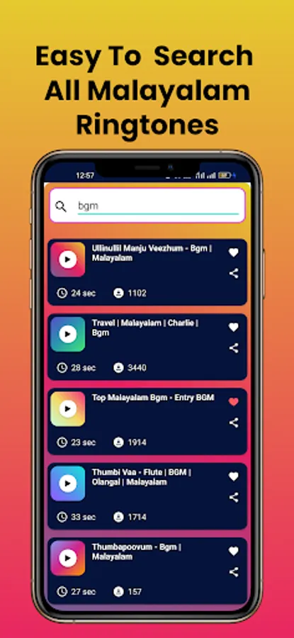 Are You Looking For Malayalam Ringtone ( മലയാളം റിംഗ്ടോൺ )? Then You are at Right Place. We Have the Ever Best Of Malayalam ringtones and Songs Collections In Our App. We Have a Best Collection Of Malayalam Songs Ringtone, Malayalam Sad Music Ringtone, Malayalam Caller Tunes, and മലയാളം റിംഗ്ടോൺ.