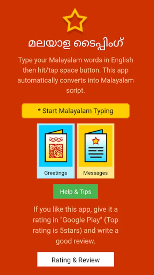 Malayalam Typing (Type in Malayalam) app is an English to Malayalam transliteration tool. Type your Malayalam words in English and hit/tap space button. This app automatically converts into Malayalam script.