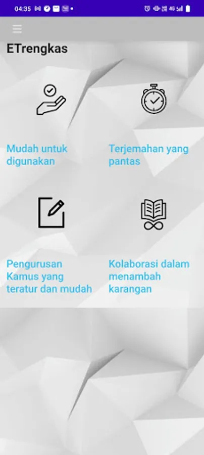 Tambahan pula, aplikasi E-Trengkas menyediakan platfom Kamus, Latihan, Terjemahan, Ringkasan, Rangkaikata dan Maklum balas untuk memudahkan pengguna untuk menggunakan applikasi ini.