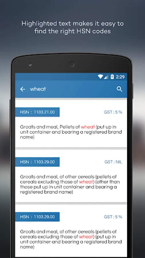 1 ) Search our extensive offline database of HSN codes, along with their respective GST rates. All your search queries are highlighted for easy navigation.