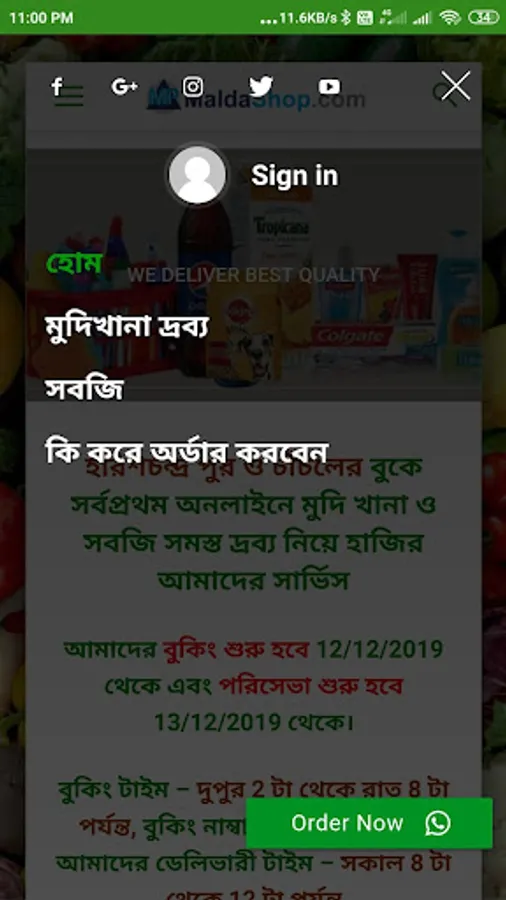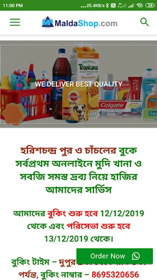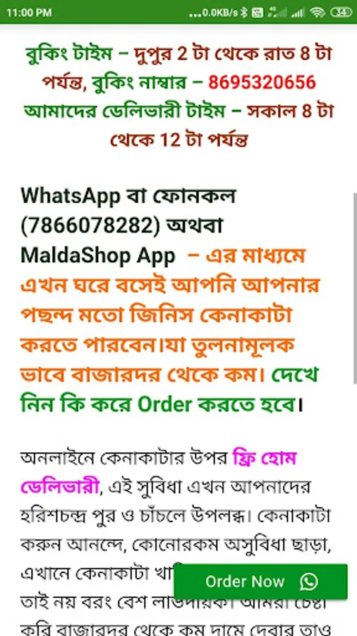 WhatsApp বা ফোনকল (8695320656) অথবা MaldaShop App – এর মাধ্যমে এখন ঘরে বসেই আপনি আপনার পছন্দ মতো জিনিস কেনাকাটা করতে পারবেন।যা তুলনামূলক ভাবে বাজারদর থেকে কম। দেখে নিন কি করে Order করতে হবে।