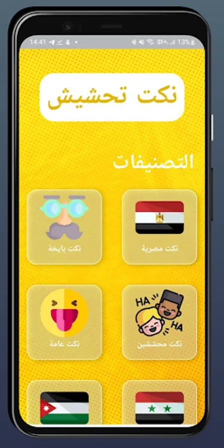 The "Tahsheesh Jokes" application contains hundreds of funny and funny jokes from various categories, including:
