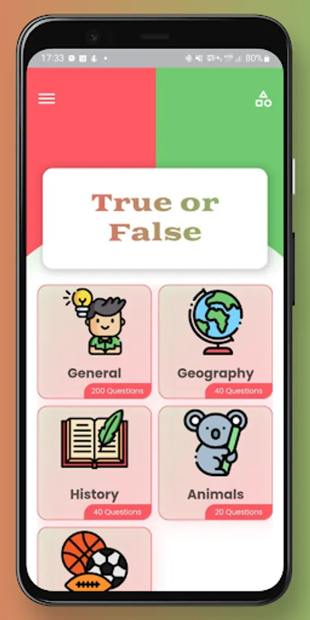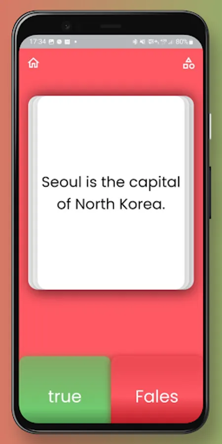 With over a thousand questions available across different categories such as history, geography, animals, sports, and general knowledge, True or False is the perfect app for anyone looking to expand their knowledge while having fun. Whether you're on the go or just looking for a fun way to pass the time, True or False is the perfect app for you.