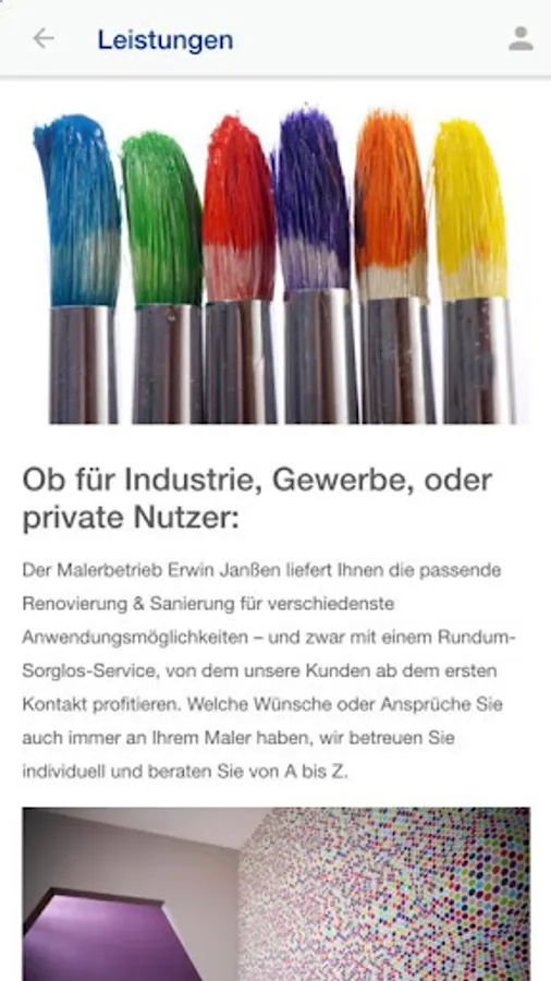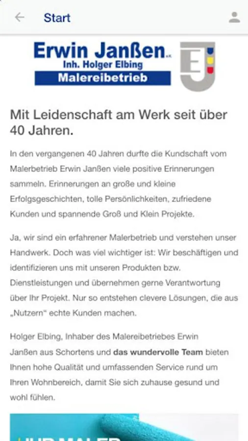 Welcome to the official app of the painting company Erwin Janßen - Inh. Holger Elbing in Schortens. Here you will find all information about our business and our offers. You can contact us easily via the app. In addition, the app contains an extensive picture gallery of our services. Download now!