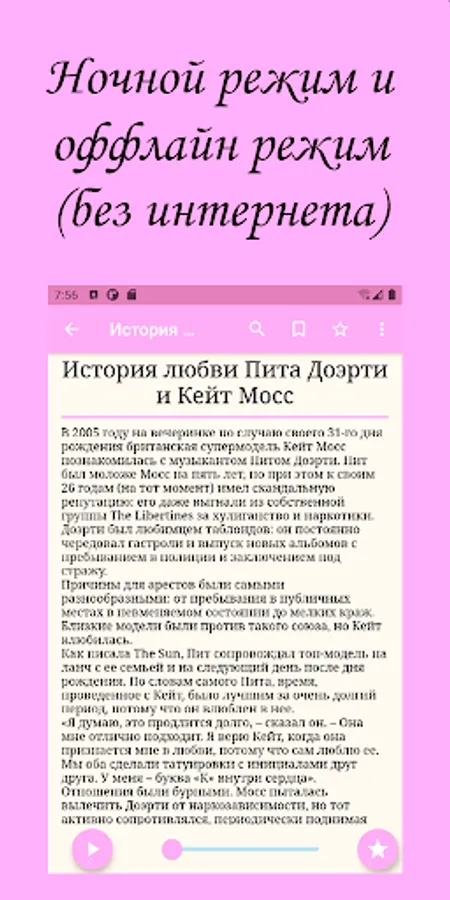 For those who are interested in the life of show business stars and love to read. The application supports night mode and offline mode (without the Internet), there is a search. The stories you like can be added to favorites, as well as shared with friends.