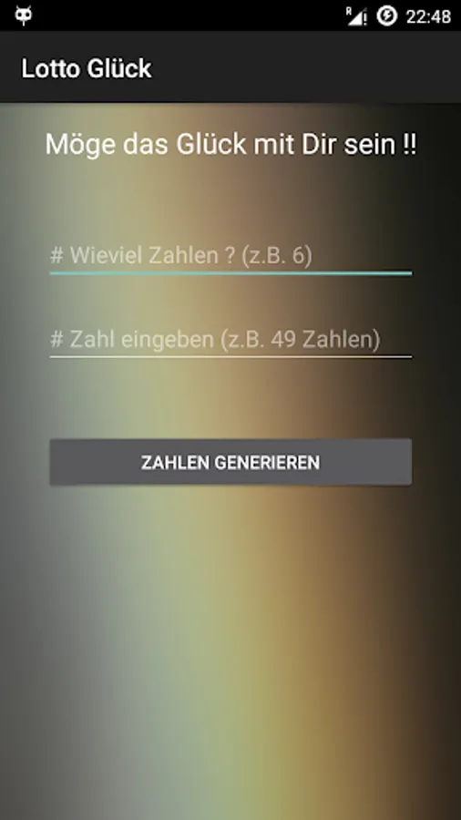 Try your luck and with generating random numbers with our new lottery numbers generator for Android and win with your own new lottery numbers. It is possible to select from different number ranges. If you need the numbers 6 out of 49, then just enter 6, and then a range of numbers 49 and generate the numbers.