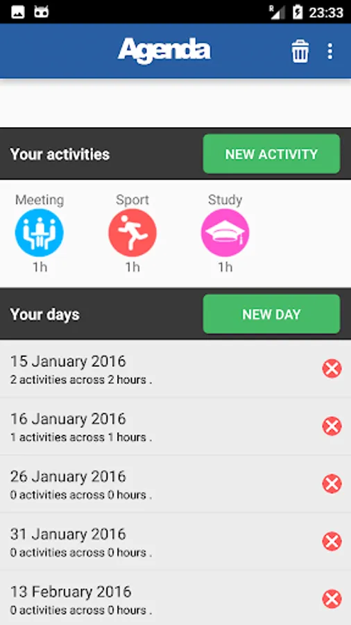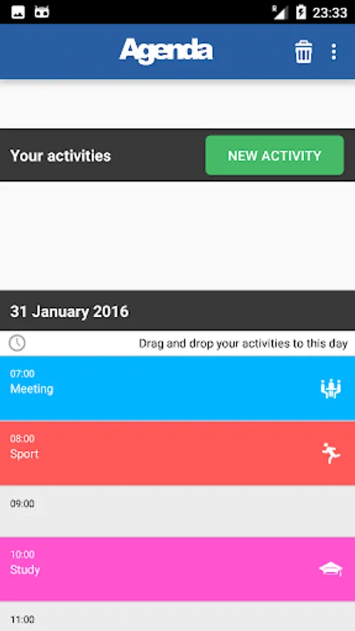 -Simply create new new activities and new days and then drag and drop the activity in a specific hour of a day !