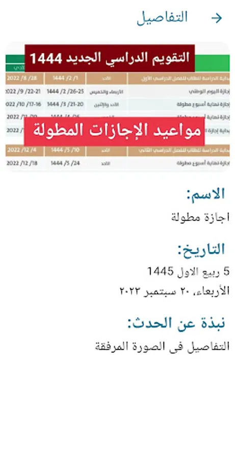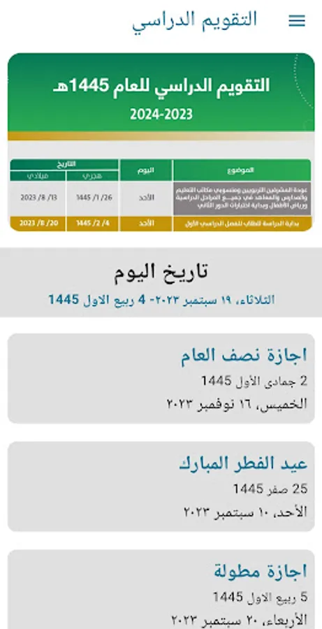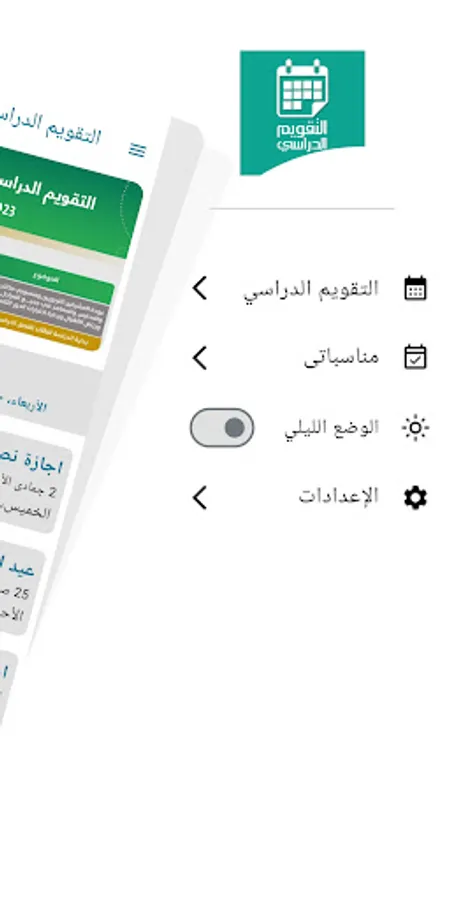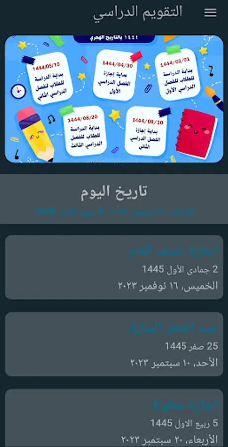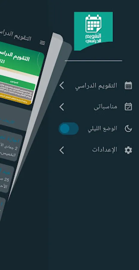 The academic calendar application is an important application for students, teachers, and parents. The application aims to display the study plan every year and alert the user about any important and new event issued by the Ministry of Education, whether a vacation, suspension of study, or important news, to help convey information with ease.