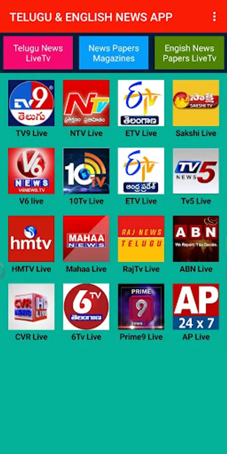 TV9 Live TV, ABN Live Channel, N TV Live News, V6 Live HD, HMTV 24/7 Live, T News Live Channel, Sakshi TV News Channel , 10TV Live HD, TV5 News Live, i News 24 X 7 Live HD, MAHAA NEWS channel, Studio N News Channel, TV1 Jai Telangana News Channel Live, CVR News 24 X 7 Telugu News Channel.
