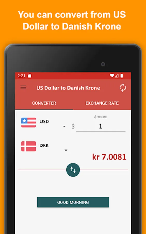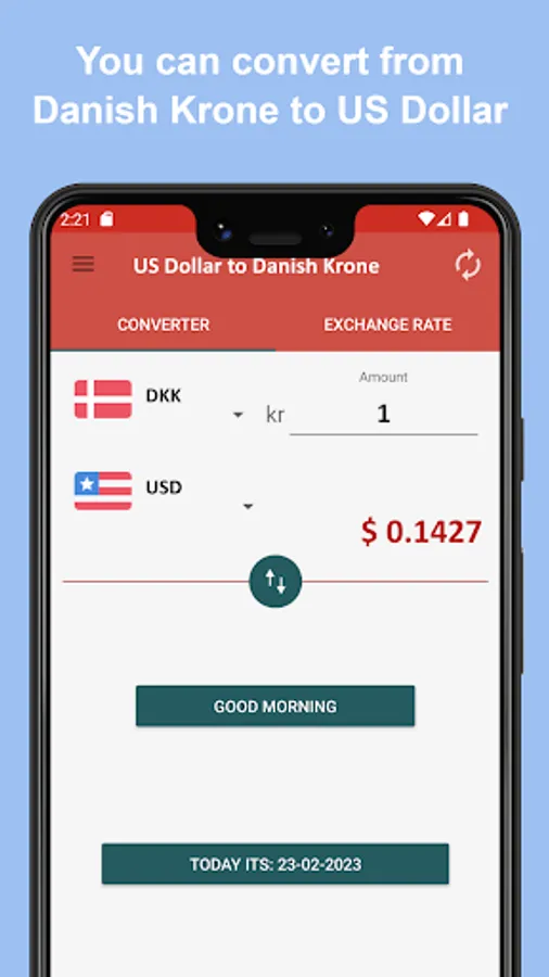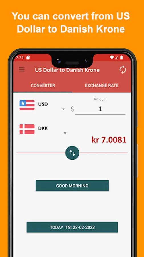 This currency converter app is an efficient US dollar to Danish krone converter to keep users updated. It works through a smart algorithm and obtains data on the current exchange rate of the US dollar in the market. Users can check the exchange rate today and convert USD to DKK and DKK to USD in a few seconds.