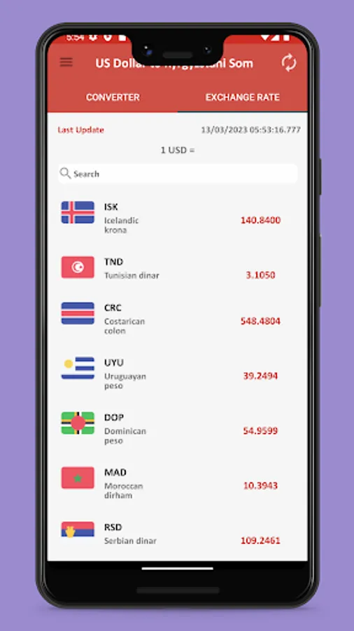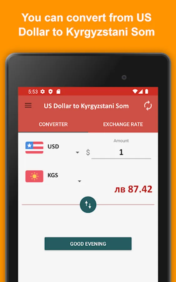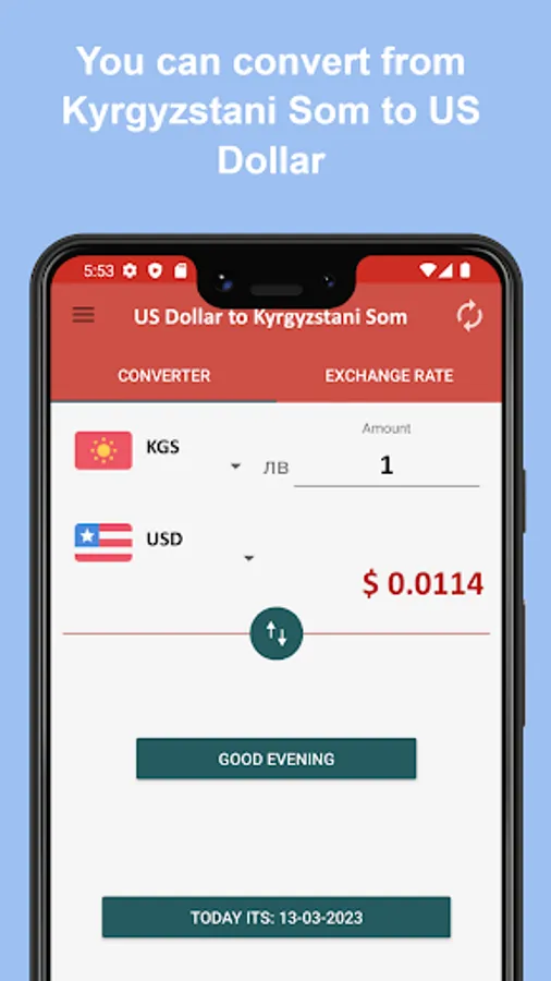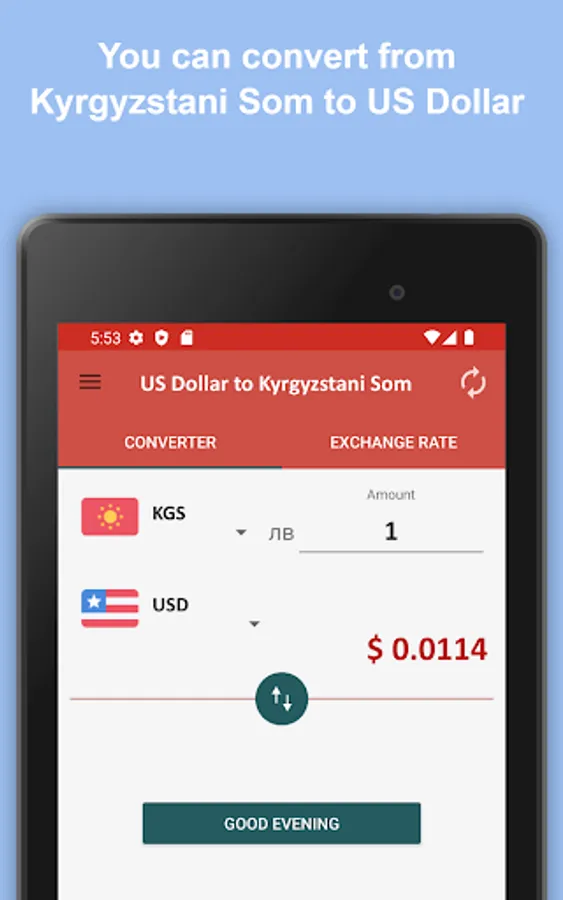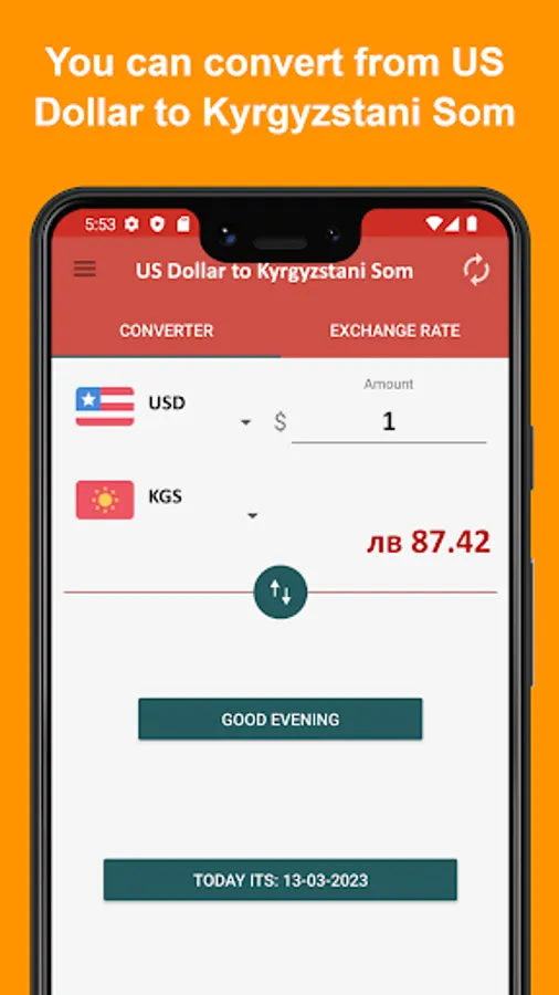This currency converter app is an efficient US dollar to Kyrgyzstani som converter to keep users updated. It works through a smart algorithm and obtains data on the current exchange rate of the US dollar in the market. Users can check the exchange rate today and convert USD to KGS and KGS to USD in a few seconds.