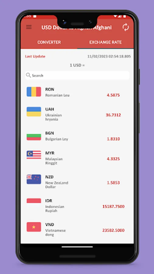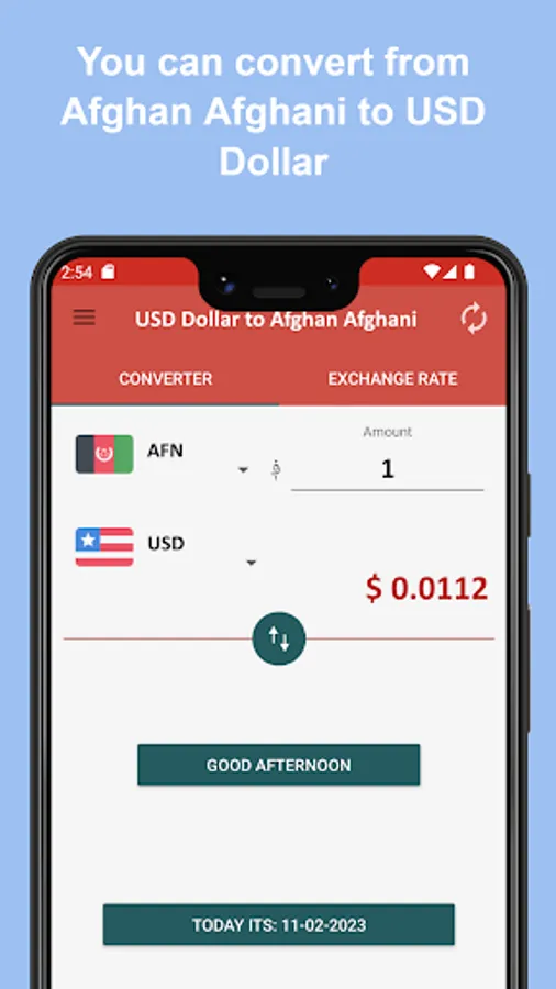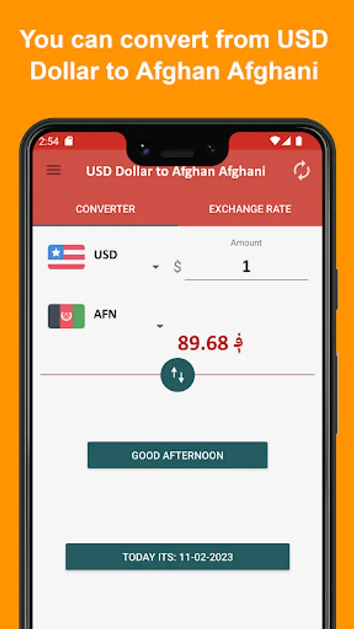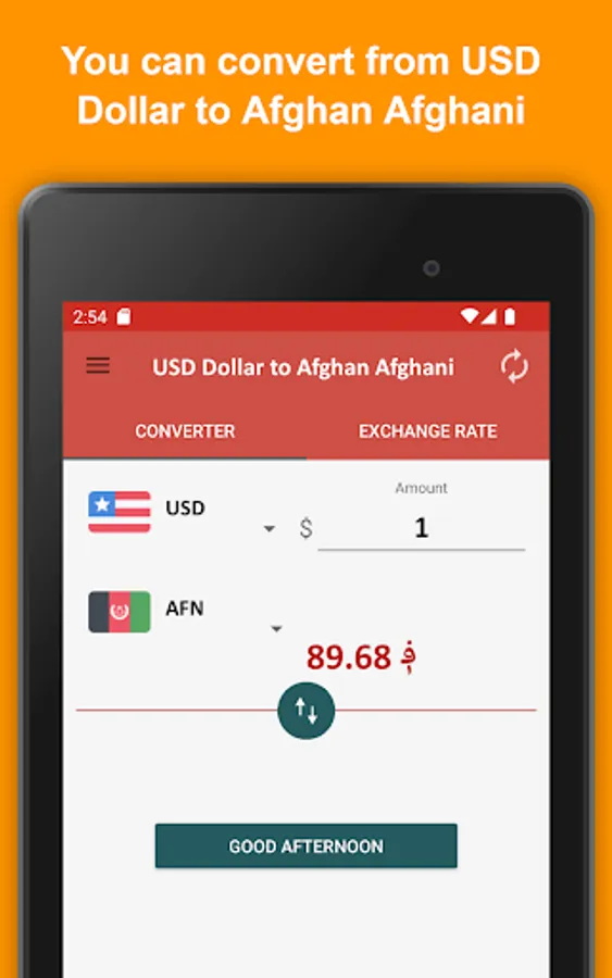 This currency conversion app is an efficient US dollar to Afghan afghani converter to keep users updated. It works through a smart algorithm and fetches data about the current US dollar exchange rate in the market. Users can check the currency rate today and convert USD to AFN and AFN to USD within a few seconds.