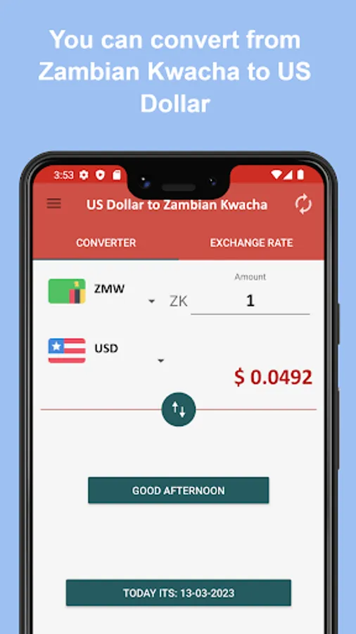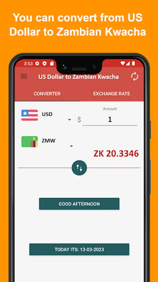 This currency converter app is an efficient US dollar to Zambian kwacha converter to keep users updated. It works through a smart algorithm and obtains data on the current exchange rate of the US dollar in the market. Users can check the exchange rate today and convert USD to ZMW and ZMW to USD in a few seconds.
